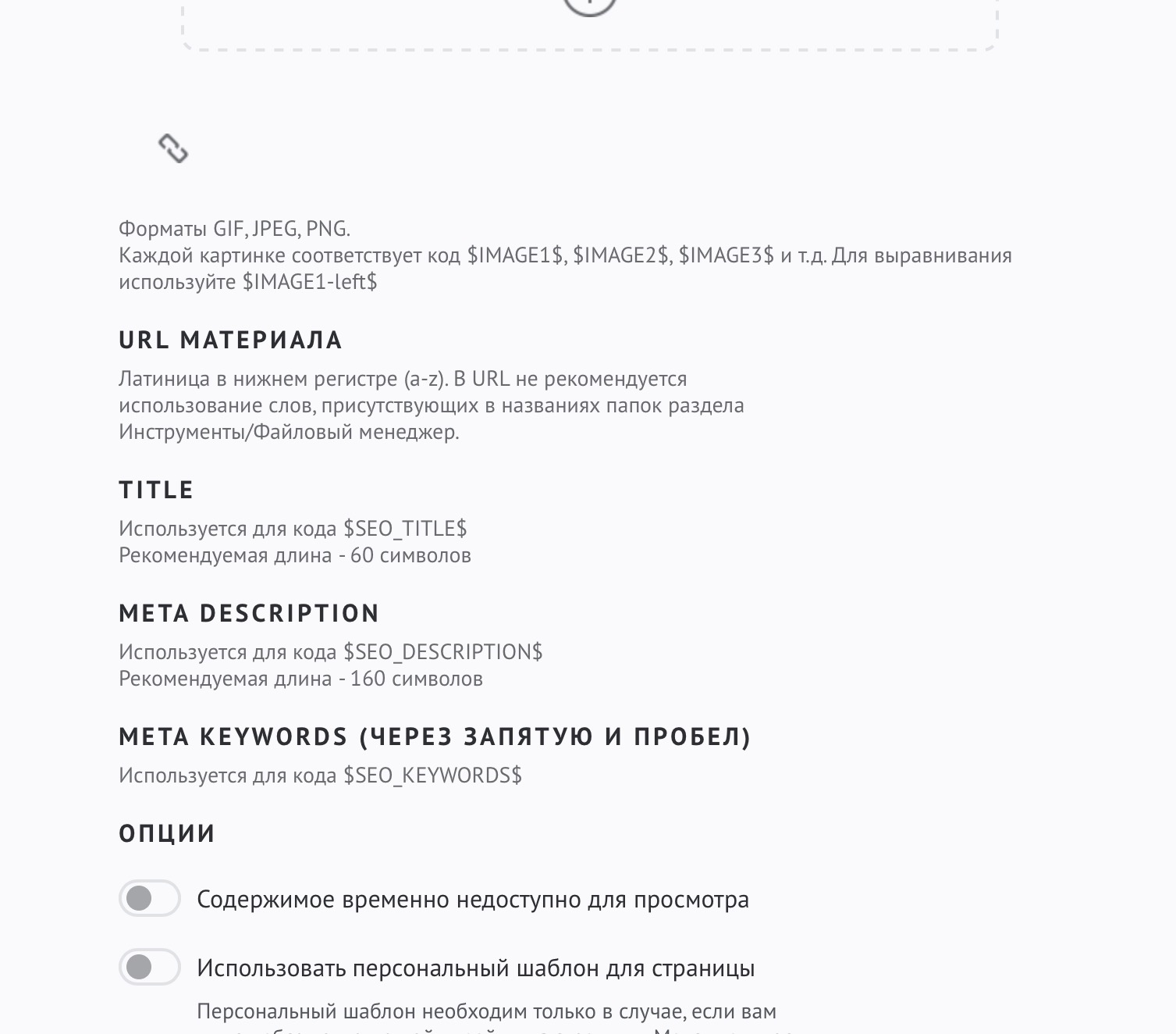 Здравствуйте! Произошла странная ситуация - перестало быть доступным изменения URL страниц и добавление индивидуальных мета-тэгов. Тариф оплачен "Оптимальный", настройка в SEO модуле включена, более того оно работало и я изменял URL, но через пару дней часть страниц с новой ссылкой созданной мной перестали быть доступными. Пришлось отключать функцию в SEO модуле чтоб вернуть страницам работоспособность хотяб по старым ссылкам. В общем сейчас изменение страницы и настройки у меня выглядят вот как на скриншоте (раздел изменения как бы появляется, но поля для ввода нет). Выключение/Включение настроек в SEO не помогло.