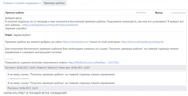 Дело в том, что в моей панели управления нет ссылки "Получить премиум шаблон". На мои последующие обращения с просьбой о помощи, ответов от службы поддержки не было. Ответ я жду вот уже вторые сутки!!! Подскажите пожалуйста, сколько мне еще нужно ждать что-бы добится решения этого вопроса? Спасибо.