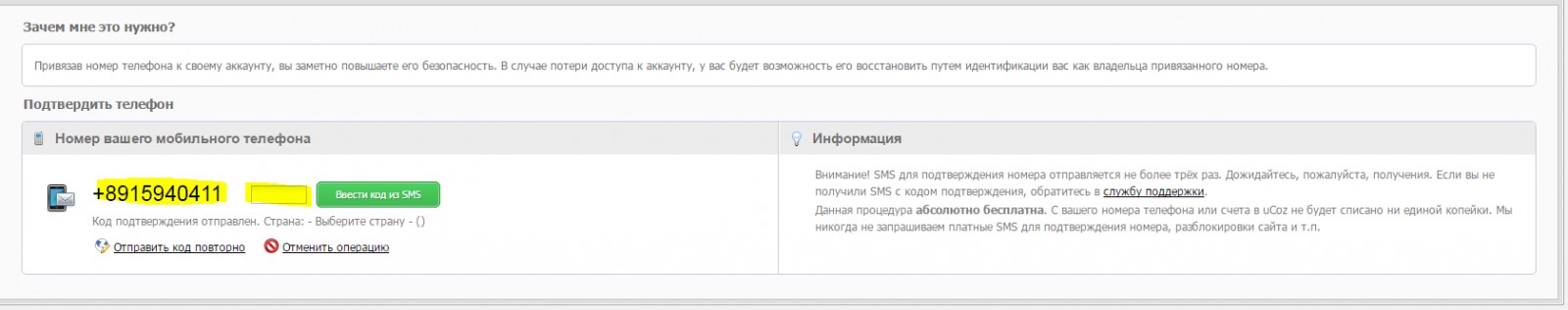 Для смены номера телефона на новый актуальный, вам необходимо обратиться в Тех поддержку с Панели управления сайтом пункт - "Помощь" - Служба поддержки - Бесплатная / Платная техподдержка. В обращении попросить сбросить текущий неактуальный, после сброса вы сможете закрепить новый.