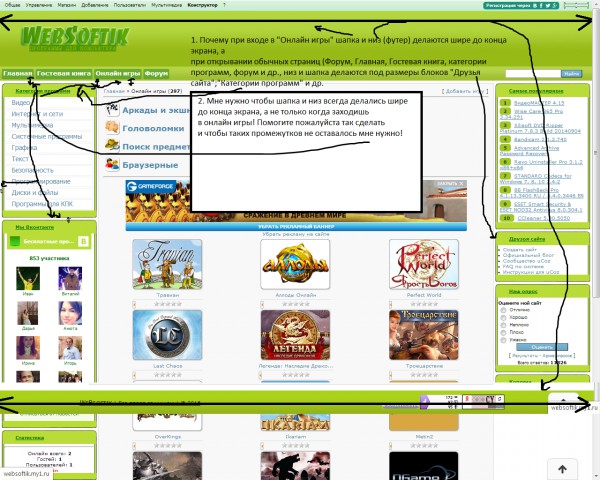При входе в онлайн игры шапка и низ делаются по своей ширине до конца экрана (ТО ЧТО МНЕ НУЖНО), а при входе на все остальные страницы, шапка и низ делаются по своей ширине до окончания блоков "Самое популярное", "Все программы" и др. Помогите мне пожалуйста сделать так, чтобы когда заходишь на все страницы, шапка и низ делались всегда до конца экрана, а не только тогда, когда заходишь в "Онлайн игры"