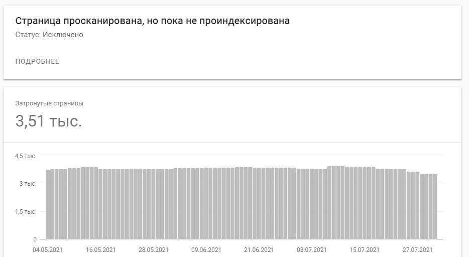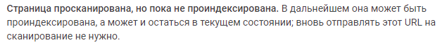 Обнаружена, не проиндексирована. Это сообщение означает, что мы нашли страницу, но пока не добавили ее в индекс Google. Обычно это объясняется тем, что роботу Google не удалось просканировать сайт, поскольку это могло привести к чрезмерной загрузке ресурса, и сканирование было перенесено на более поздний срок. Именно поэтому в отчете не указывается дата последнего сканирования.