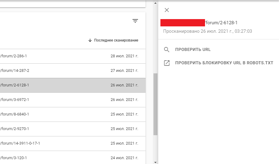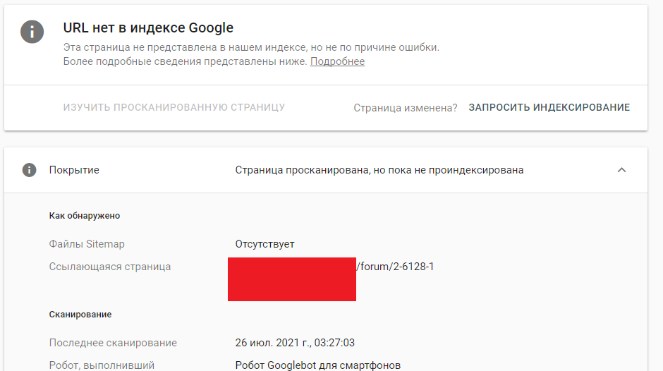 Допустим, захожу в раздел - "Страница просканирована, но пока не проиндексирована". Далее открываю одну из страниц форума и нажимаю "Проверить url". Все остальное смотрите по скринам ниже (1 последний скрин не удалось загрузить, лимит)