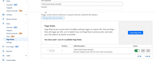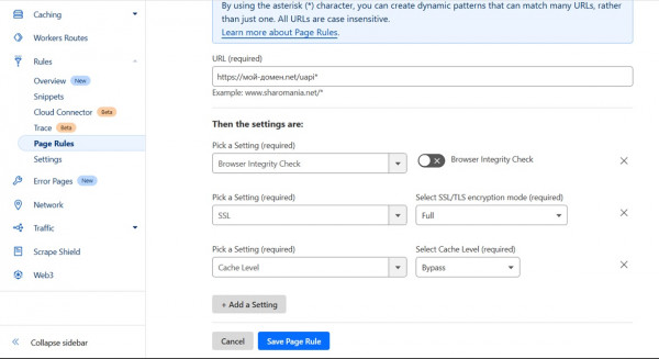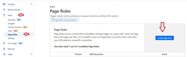1. Перейдите в Правила -> Правила страниц -> Создать правило страницы (Rules -> Page Rules -> Create Page Rule)