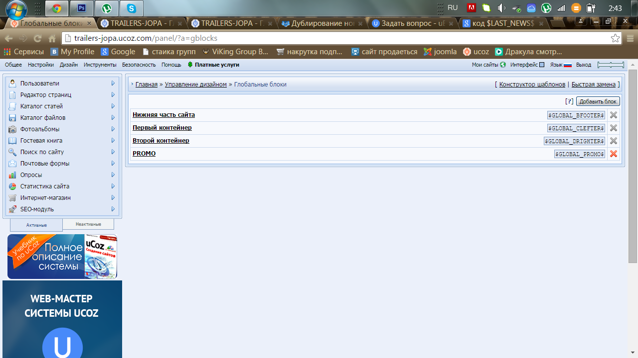 Стандартные глобальные блоки удалить невозможно из списка, но их можно убрать из шаблонов страниц. Для этого необходимо перейти на страницу Панель управления - Дизайн - Управление дизайном (шаблоны) и из нужного шаблона удалить переменную, которая выводит глобальный блок: $GLOBAL_DRIGHTER$