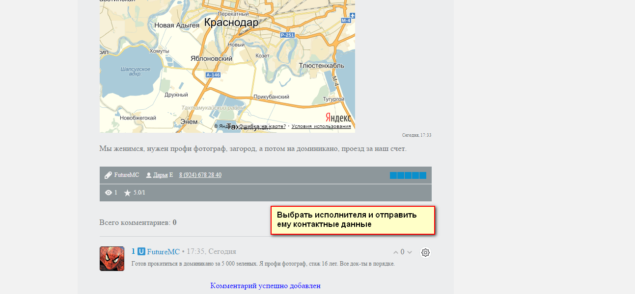 Заказчик добавил объявление (доска объявлений), ему исполнитель в комментариях ответил...