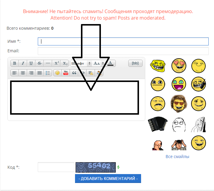 Но спамеры все равно строчат комменты. Надпись не замечают. Хочу сделать, чтобы эта надпись (или картинка с надписью) была прямо в окне добавления комментариев, чтобы спамерам прямо в упор светила ))